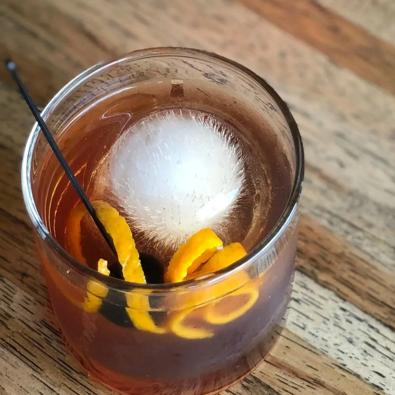 -OLD FASHIONED — Bourbon, Angostura bitters, cherry syrup, orange; big ice cube; Luxardo cherries & orange twist.